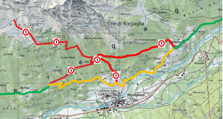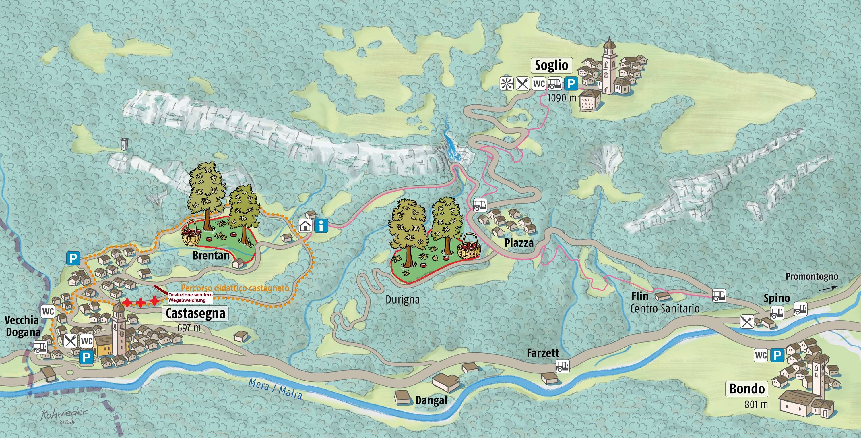 Ab dem 27.09. bis auf Weiteres wird der Wanderweg in der Ortschaft Brentan - Castasegna infolge Bauarbeiten umgeleitet (siehe Mappe).