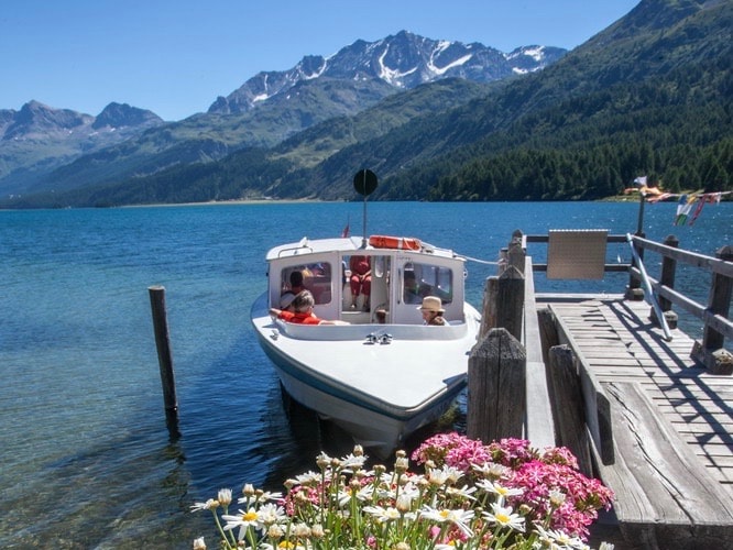 ...überquert das höchstgelegene Kursschiff Europas den Silsersee, legt in Plaun da Lej und in Maloja an und passiert geschichtsträchtige Orte wie die Halbinsel Chastè, wo unter Lärchen jene Bank steht, auf der Friedrich Nietzsche einst Inspiration für seine Bücher fand. Vierzig Minuten dauert die gesamte Rundfahrt auf dem grössten See Graubündens. Die Route von Sils nach Maloja ist aber auch eine willkommene Abwechslung zur klassischen Vier-Seen-Wanderung, die man auf diese Weise entspannt um eine Stunde verkürzen kann. Die höchstgelegene Kursschifflinie Europas gibt es schon über hundert Jahre.