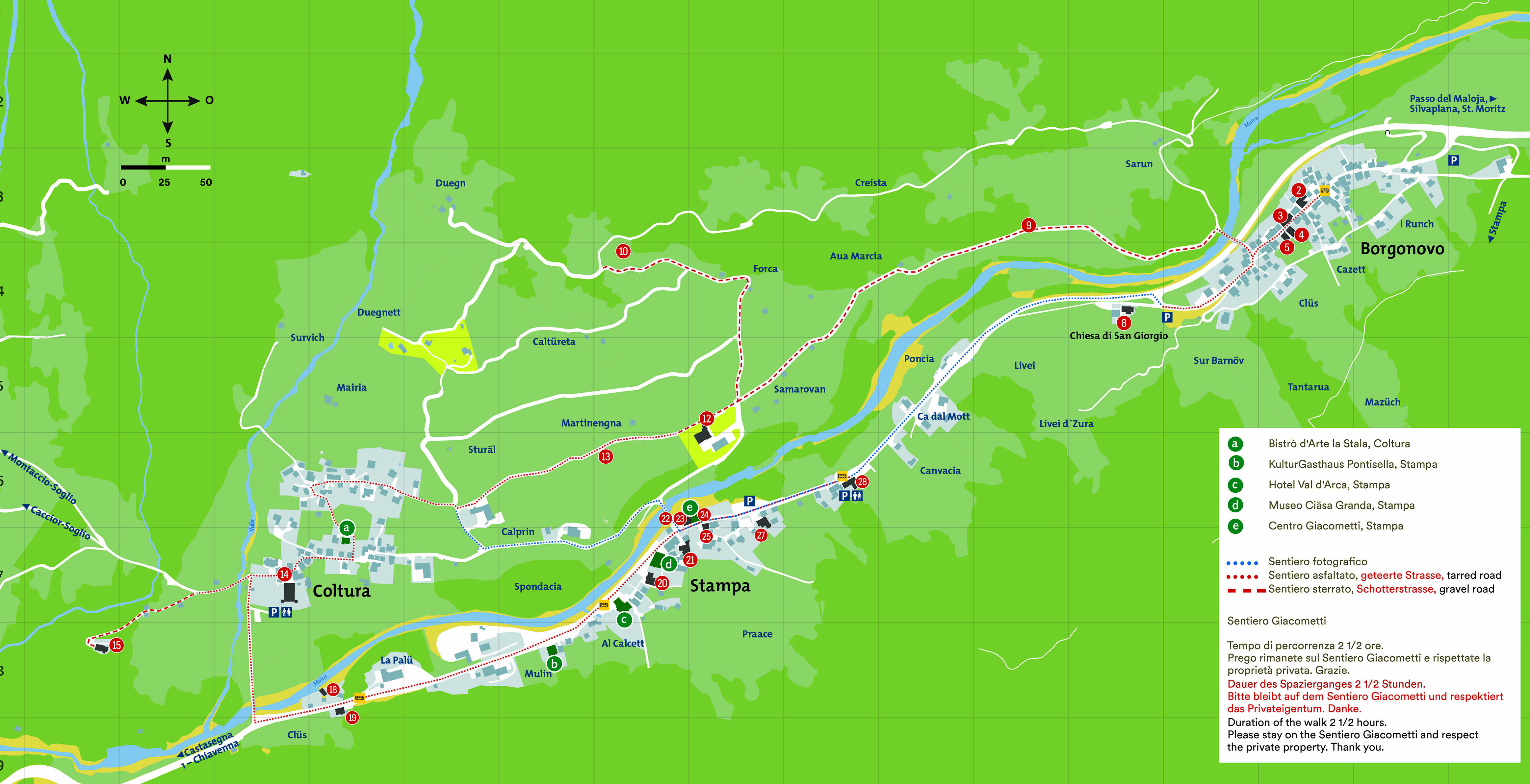 Die Schulgeschichte von Stampa reicht weit zurück. Nach der Reformation um 1550 unterrichteten im Oberen Bergell italienische Pfarrer in privaten Schulen. Dokumentiert ist der Unterricht im Jahr 1777 in den Weilern Montaccio, Coltura, Stampa und Borgonovo. Eine Bergeller Eigenart: Auswandererfamilien bereiteten ihre Kinder auf eine Geschäftskarriere im Ausland vor. Dieses Gebäude, 1670 ursprünglich als Pfarrwohnung und Raum für Gottesdienste erbaut, diente ab Mitte des 19. Jahrhunderts als Primarschulhaus der öffentlichen Schule. Zunächst aber noch ohne Kinder aus Borgonovo, die dort privaten Unterricht erhielten. Anfangs waren einige Eltern skeptisch, was die Schule betraf, denn ihre Kinder waren für die kleinen landwirtschaftlichen Betriebe unverzichtbare Hilfen, etwa als Hirten. In diesem Haus gingen auch alle künftigen Künstler der Familie Giacometti für sechs Jahre in die Schule. Augusto erinnerte sich: «Am besten gefiel mir Zeichnen und Gesang. Einen ganzen Nachmittag hatte man nur diese beiden Fächer. Ich war im Paradies.» Zeichnen unterrichtete damals in allen Klassen Augustos Onkel Zaccaria Giacometti. Etwas später zeichnete hier Alberto mit Farbstiften römische Schlachtenszenen und biblische Landschaften. Seit 1963 findet der Unterricht im von Bruno Giacometti erbauten Schulhaus jenseits des Flusses Maira statt.